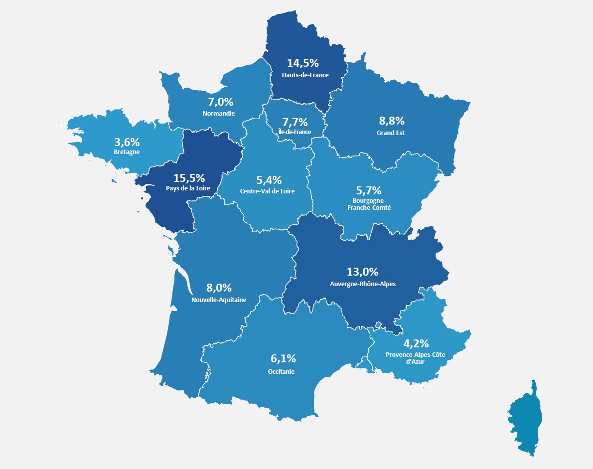La répartition géographique des CDII se concentre à plus de 40 % dans 3 régions caractérisées par une forte orientation industrielle : Pays de la Loire : 15,5 %, Hauts-de-France : 14,5 %, et Auvergne-Rhône-Alpes: 13,0 %.