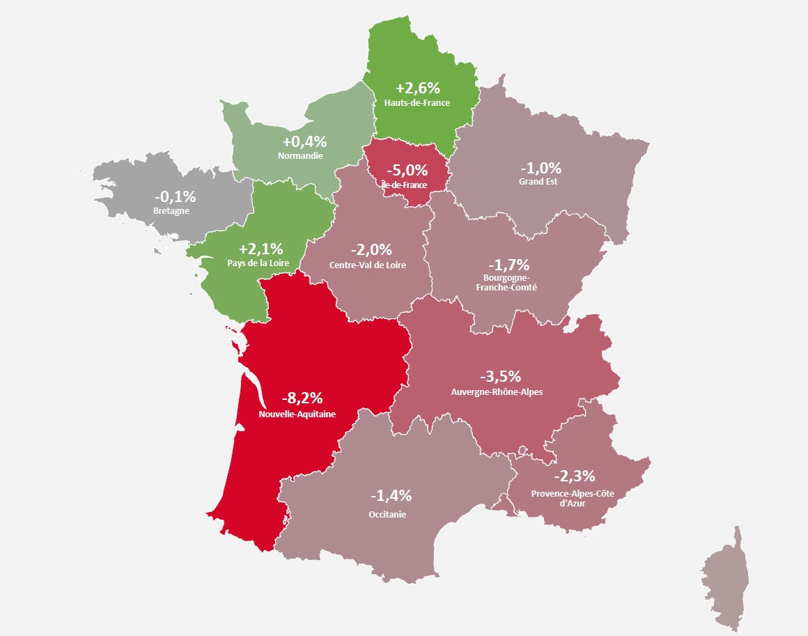 La majorité des régions métropolitaines est en baisse.
