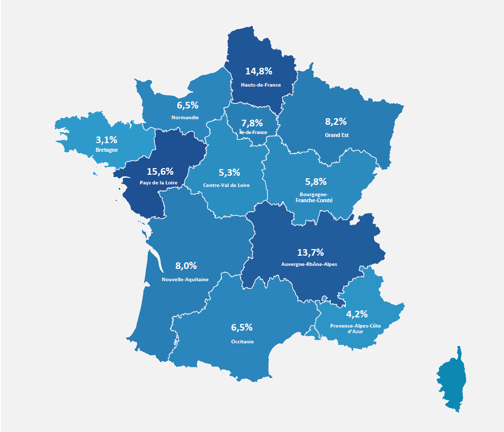 La répartition géographique des CDII se concentre à plus de 40 % dans 3 régions caractérisées par une forte orientation industrielle : Pays de la Loire : 15,6 %, Hauts-de-France : 14,8 %, et Auvergne-Rhône-Alpes: 13,7 %.