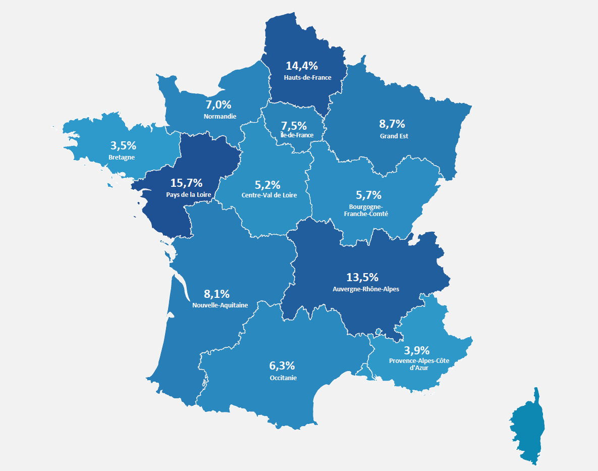 La répartition géographique des CDII se concentre à plus de 40 % dans 3 régions caractérisées par une forte orientation industrielle : Pays de la Loire : 15,7 %, Hauts-de-France : 14,4 %, et Auvergne-Rhône-Alpes: 13,5 %.