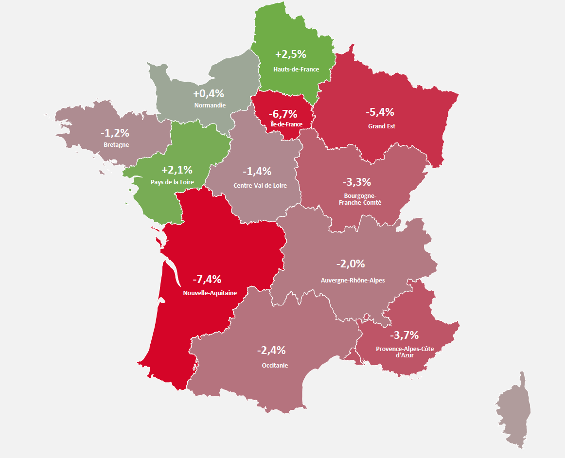 Les dynamiques territoriales restent contrastées. Le travail temporaire se développe dans les régions Hauts-de-Franc e(+2,5%), Pays de la Loire (+2,1%) et Normandie (+0,4%). Il reste plus en retrait en Nouvelle-Aquitaine (-7,4%) et en Île-de-France (-6,7%), avec dans les deux cas, une chute des activités du secteur du commerce.